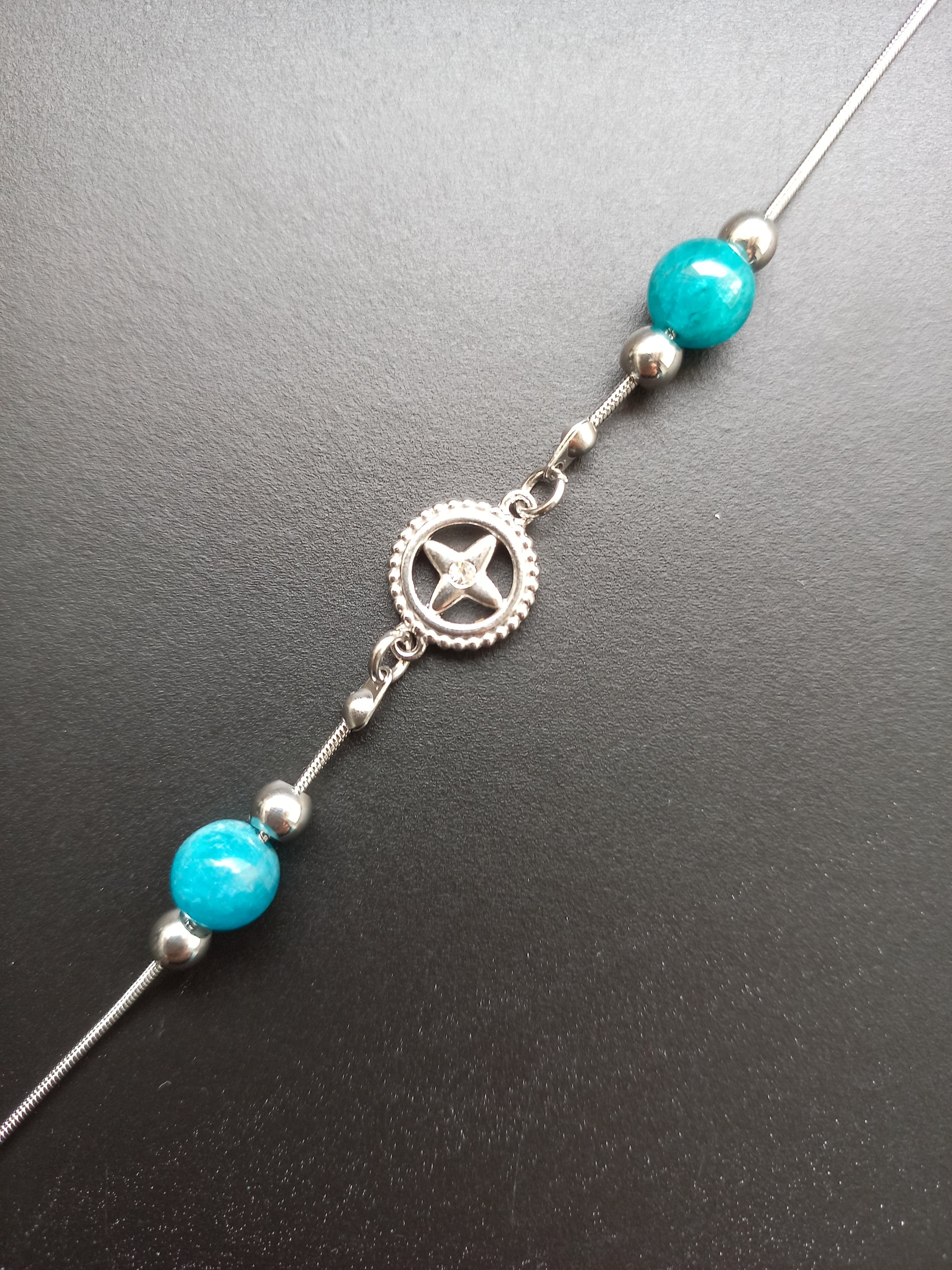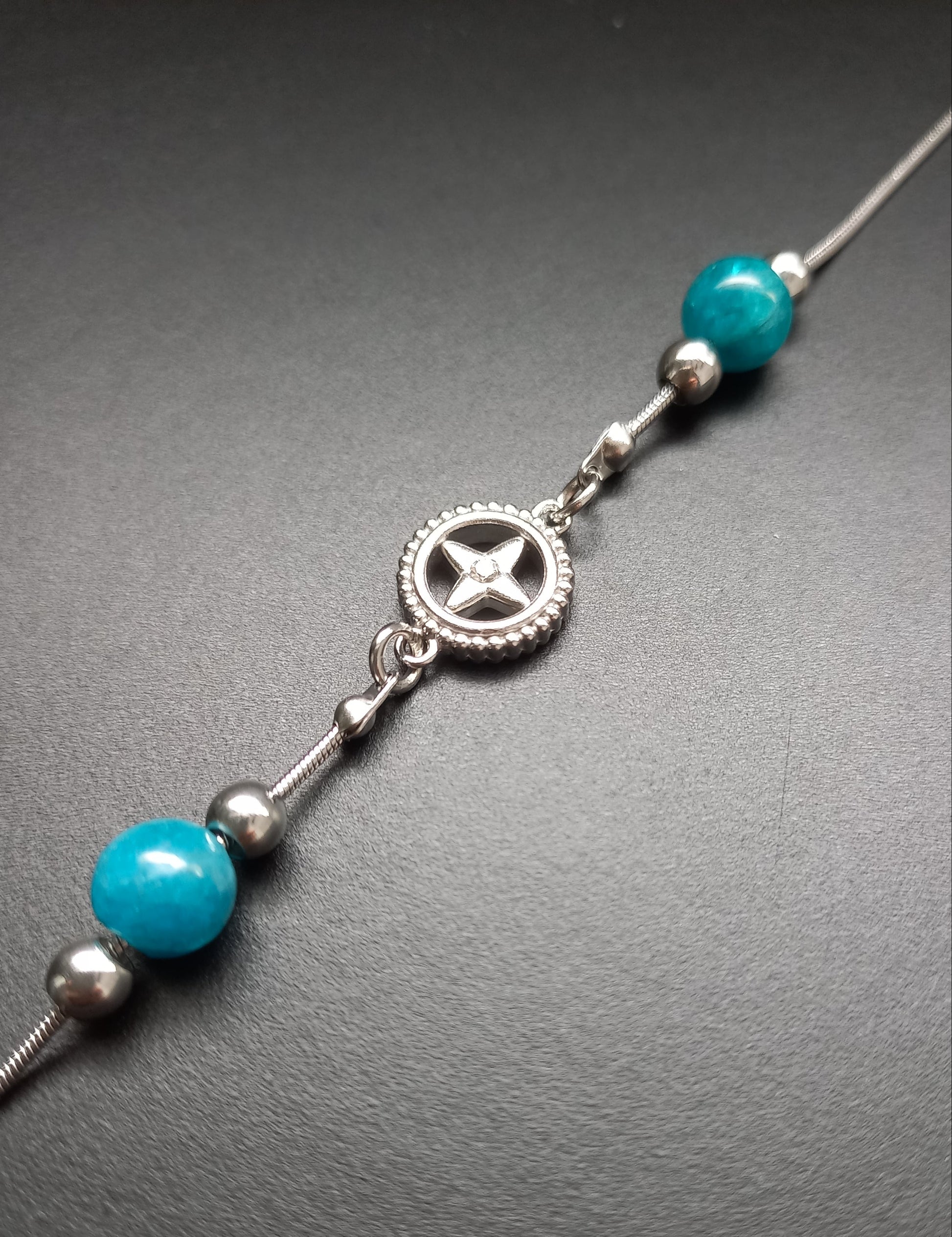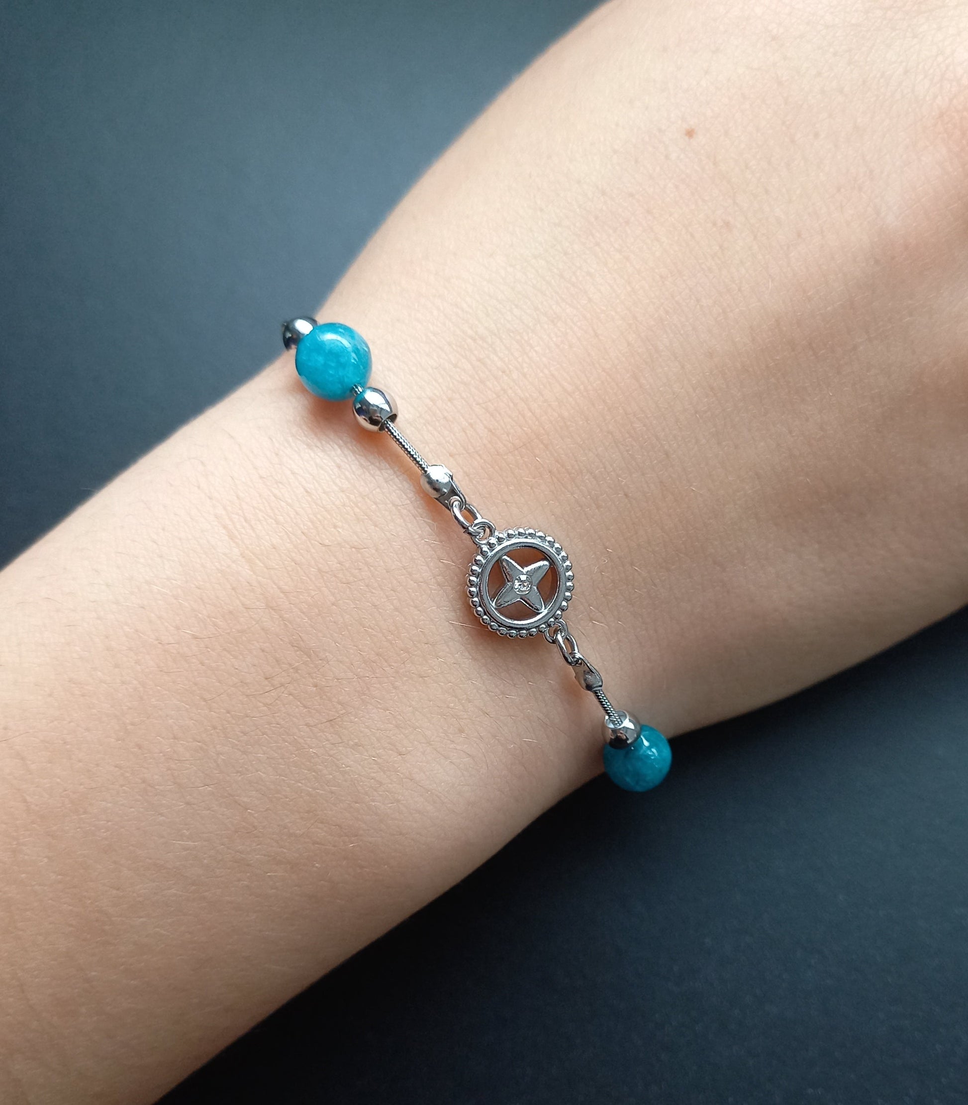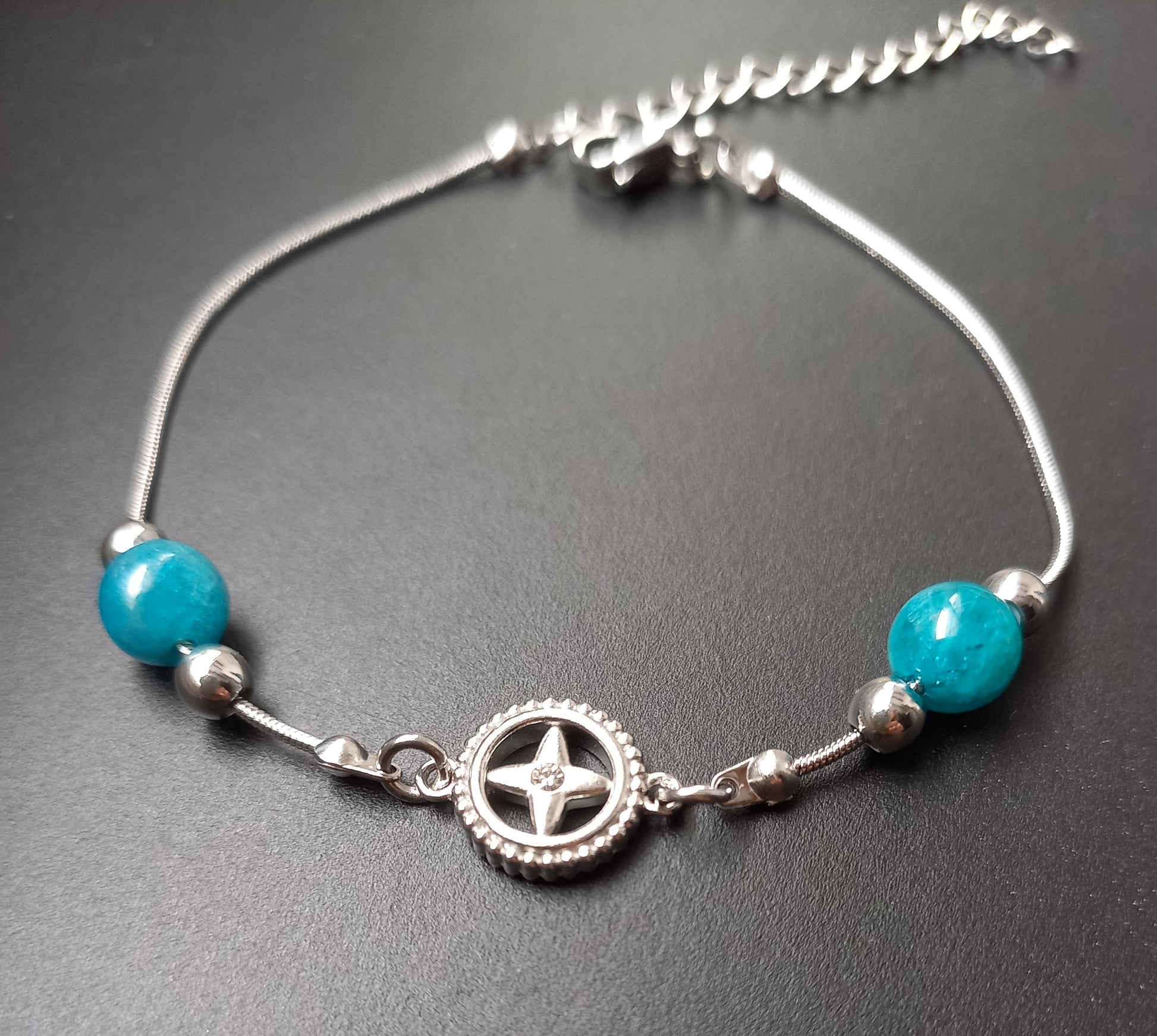 Deux perles d'apatite bleue, une étoile centrale sertie d'un éclat délicat. Polaris, bracelet fin et délicat, est inspiré des étoiles, guides célestes à l'éclat intemporel.