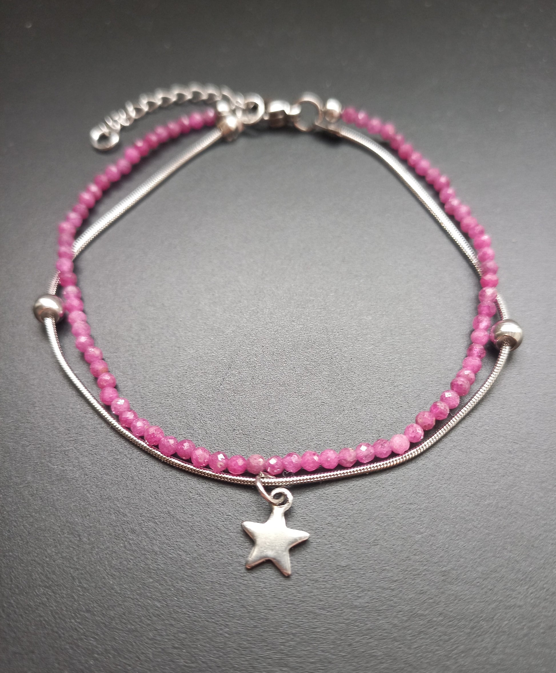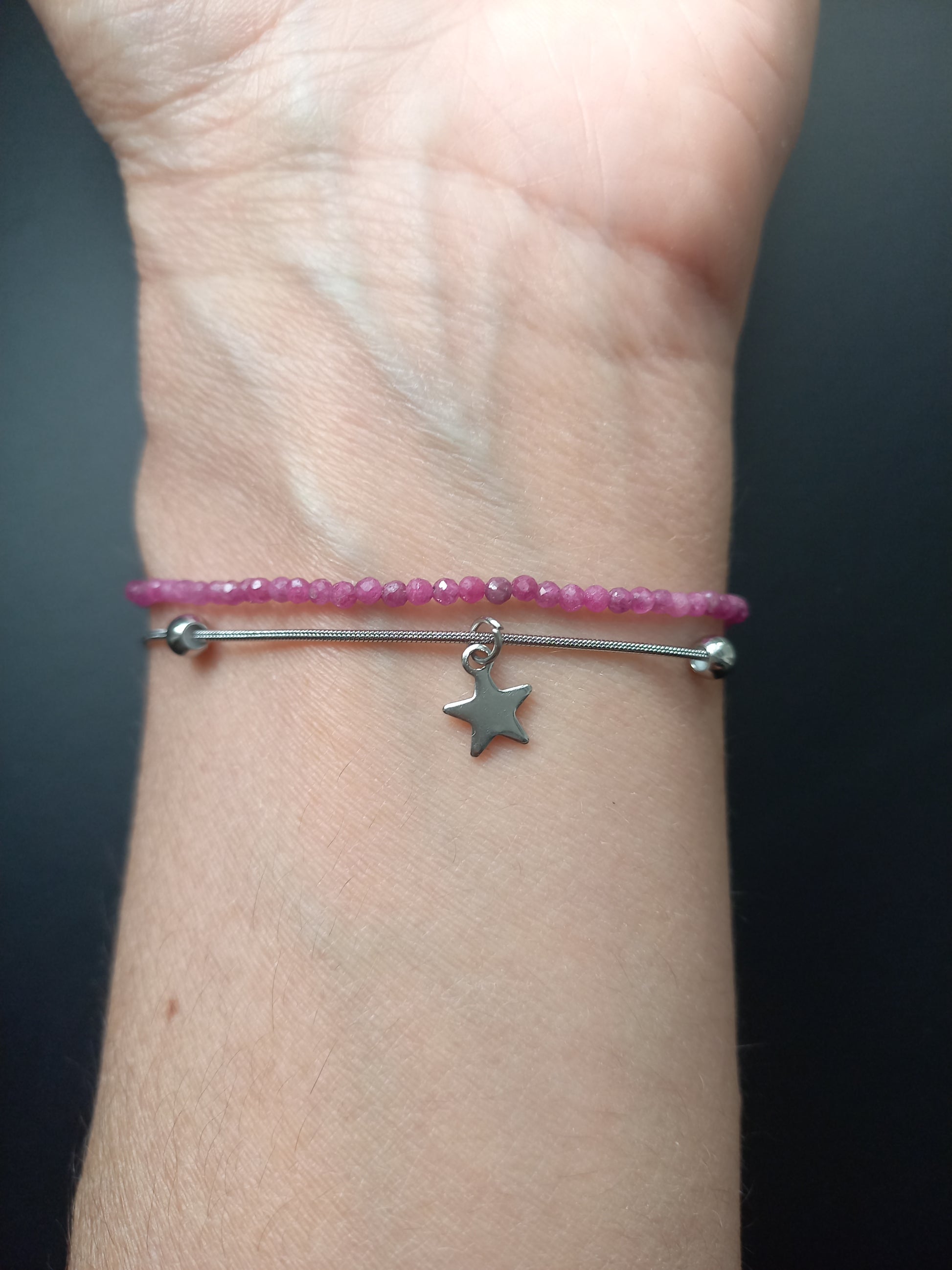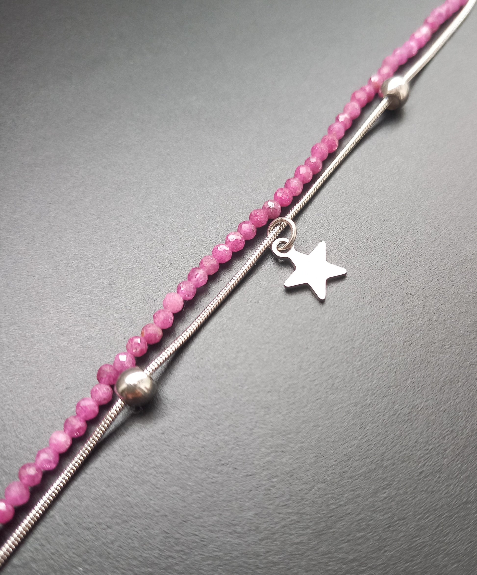 Un rang de fines perles facetées de rubis unit à une étoile en acier inoxydable, délicatement suspendue à une chaine serpentine en deuxième rang.