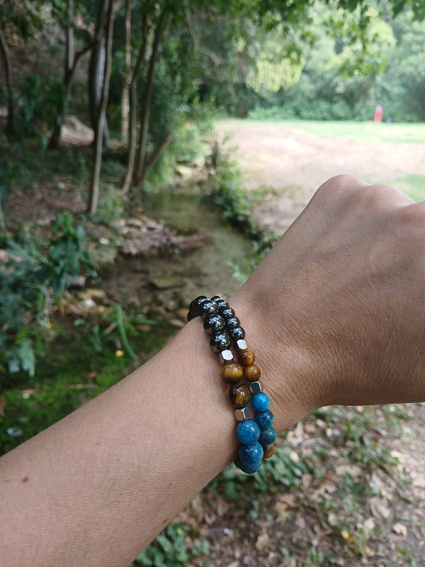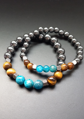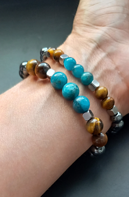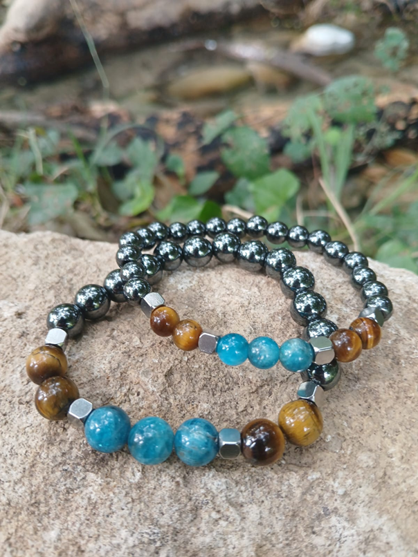 Hématite en pierre d'ancrage, la protection de l'oeil de tigre et apatite pour la communication : trois énergies harmonieusement complémentaires.