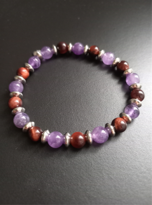 L'améthyste invite au calme interieur et à l'apaisement et à la clarté d'esprit. L'oeil de taureau stimule la force interieure et la détermination. Il est aussi un puissant bouclier contre les énergies négatives.