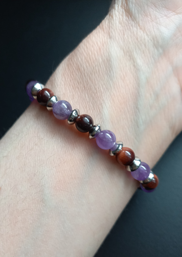 L'éclat violet profond de l'améthyste s'unit aux reflets flamboyants de l'oeil de taureau. Le bracelet Eliandre est une alliance de mystère et de puissance.
