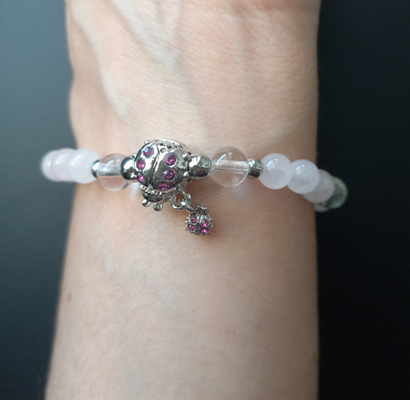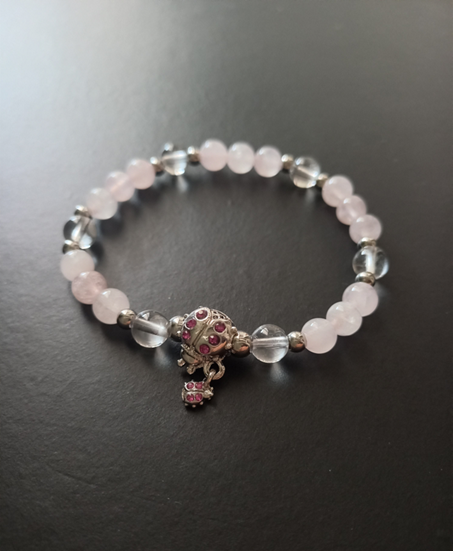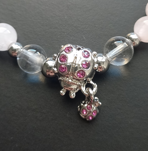 Quartz rose et cristal de roche accompagnent un délicat message de bonheur. Une coccinelle ornée de strass roses : douce, glam et lumineuse !