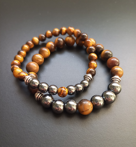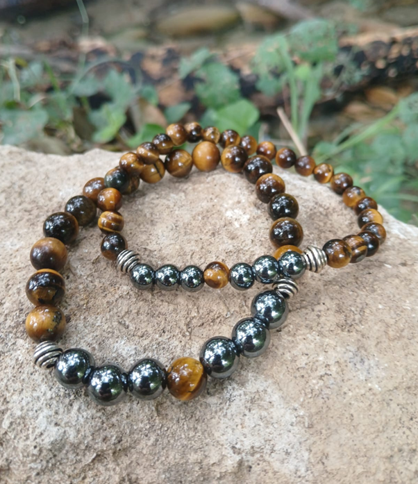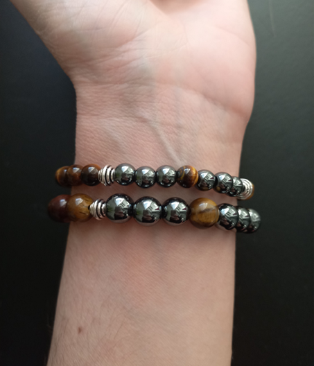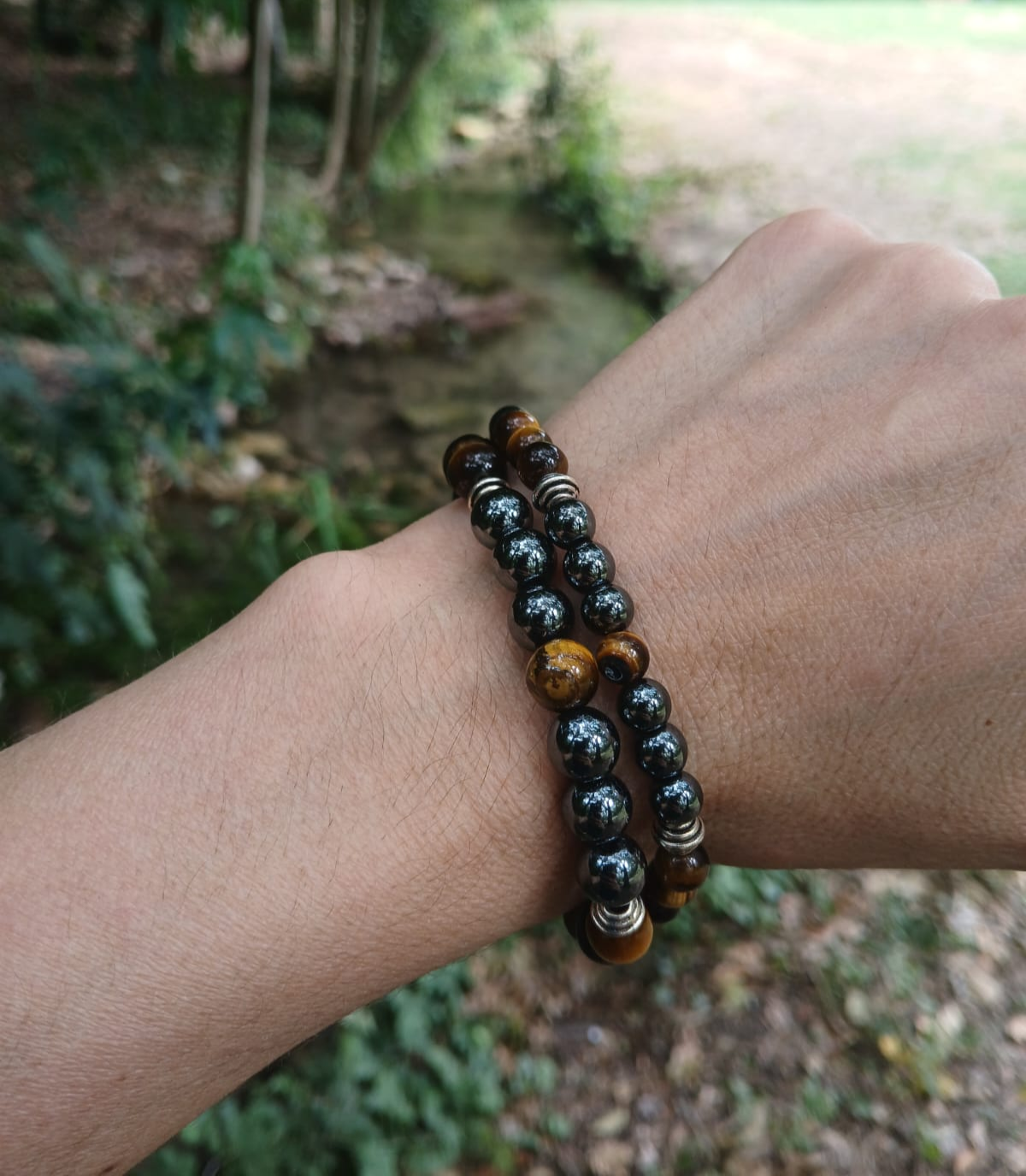 Les reflets dorés de l'oeil de tigre se mêlent à l'intensité de l'hématite. Le bracelet Sylvaé, entre ombre et lumière d'une forêt profonde, incarne force et harmonie.